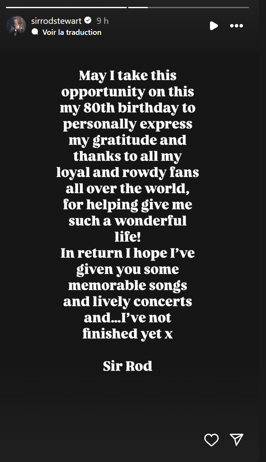 Joyeux anniversaire Rod Stewart ! L'iconique musicien britannique franchit un cap important : celui de ses 80 ans. Un âge symbolique, que l'artiste semble vivre avec beaucoup de sérénité, comme le prouve son message enthousiaste posté en story de son compte Instagram.