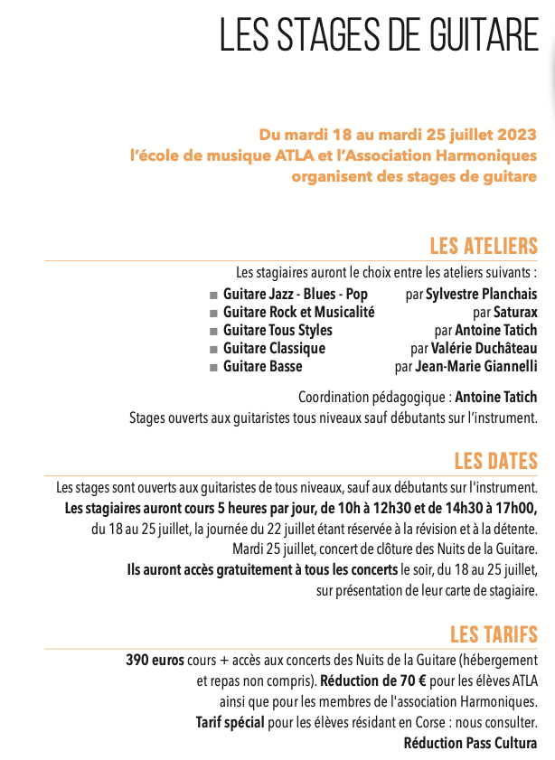 Des stages de guitare seront également disponibles dispensés par l'école de musique ATLA et l'Association Harmoniques. Les stagiaires auront cours 5 heures par jour, de 10 heures à 12h30 et de 14h30 à 17 heures.
