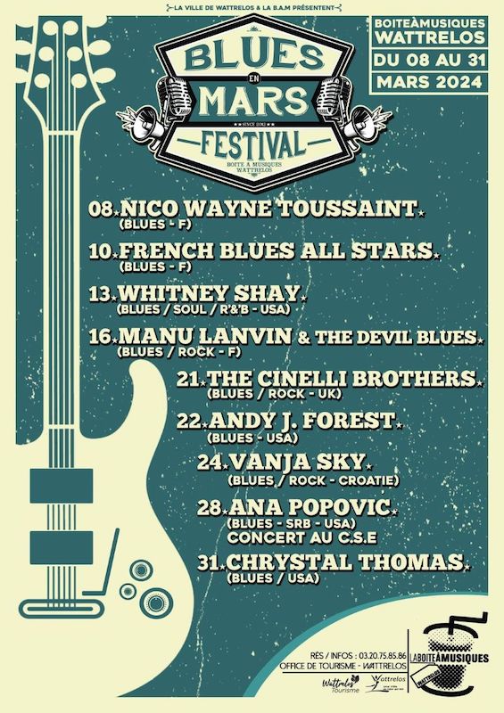 Si en ce moment, la grisaille et le froid rythment la vie des français, on a déjà tous la tête à la fin de l'hiver, et au retour à des températures plus clémentes. Car qui dit temps moins maussade, dit sorties et également retour des festivals ! C'est justement de ça qu'on va parler aujourd'hui : cette année, comme chaque année depuis 11 ans désormais, aura lieu dans la ville de Wattrelos un événement qui est devenu incontournable pour les amateurs de blues de la région : le Blues en Mars Festival.