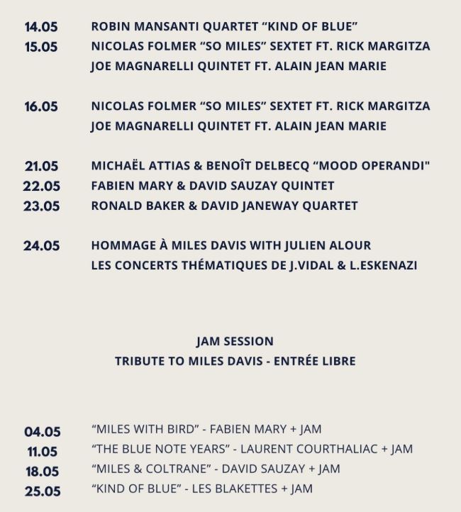 Joe Magnarelli, Nicolas Folmer, Benoît Delbecq, Michaël Attias, Robin Mansanti, Fabien Mary, Laurent Courthaliac, Rick Margitza, Ronald Baker, et bien d'autres encore, voilà un aperçu des noms qui viendront sur la scène du Sunset Sunside pour rendre hommage au grand Miles Davis, à travers des concerts, des jam sessions, des reprises,... Bref, une belle fête organisée pendant tout le mois de mai, du 14 jusqu'au 26. Et pour toutes les informations concernant la programmation exacte et les tarifs, on vous invite à vous rendre sur le site officiel du Sunset Sunside Jazz Club !